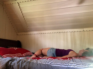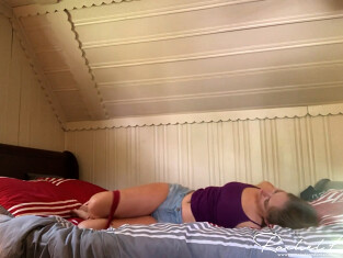 Join Rachel Adams for an intimate and relaxed rope bondage session in a cozy bedroom. Dressed casually in a soft purple tank top and snug denim shorts, Rachel sets the tone for a quiet, self-contained ritual. With a coil of red rope in hand, she begins by methodically tying her ankles together, her focus calm and deliberate.